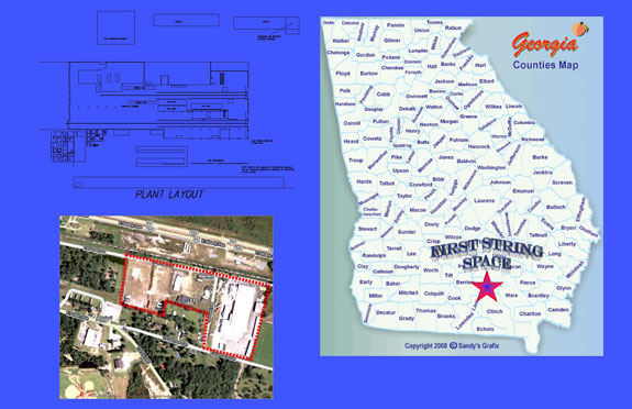 First String Space, Inc. is located in Pearson, Georgia (or South Central Georgia). Our main plant is 100,600 SQFT not including a 14,800 SQFT final finish area. We have 27,800 SQFT of outside material storage and offices. The total is 143,200 SQFT on 10 acres of asphalt and 13 additional acres of module storage.